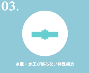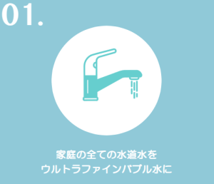 | 水道の元栓にUFB DUAL™を設置することで、水道の水圧のみでウルトラファインバブルを連続的に生成し、建物内の水をすべてウルトラファインバブル水にすることができます。 | UFB DUAL™は、雑菌やウイルスなど何が潜んでいるかわからない外気を取り入れず、清潔な水道水の中に溶け込んでいる空気のみでウルトラファインバブルをつくる構造のため、非常に清潔です。 |
