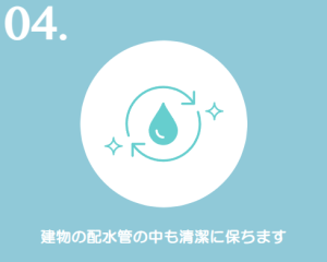 | 水量・水圧減はノズル式のファインバブル生成方法では避けられない欠点だと言われてきました。UFB DUAL™は、この問題を特許技術のDUAL構造で克服し、これによって圧力減を極限まで抑え、水道機器認証の取得を可能にしました。 | 普段目にすることがほとんどない建物の配水管ですが、年月の経過とともにバイオフィルムやバイオフィルムに付着するスケール、尿石(尿が石化して配水管内部にこびり付いたもの)の付着を防ぐことで配水管を清潔に保ち建物を長持ちさせます。 |